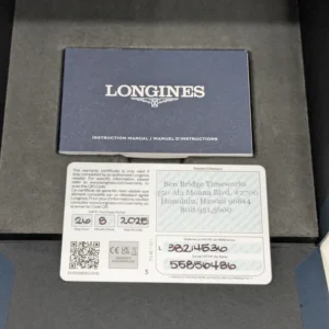 État : La montre est en excellent état et affiche une précision de 11 secondes par jour. Elle présente de légères traces d’usure ; l’autocollant est toujours présent au dos du boîtier.