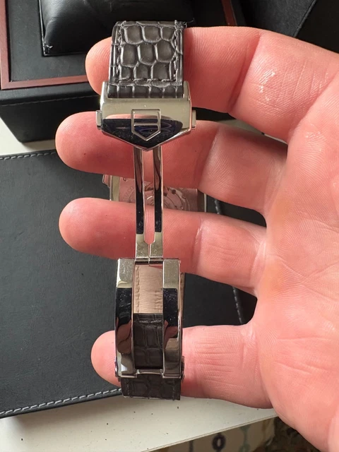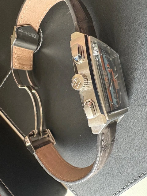 Voici une superbe Tag Monaco en excellent état, aux couleurs Gulf. Elle est dotée d’un joli bracelet en cuir gris.