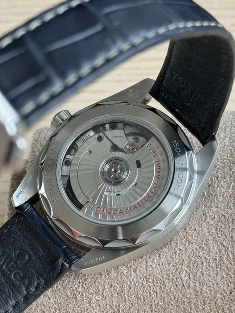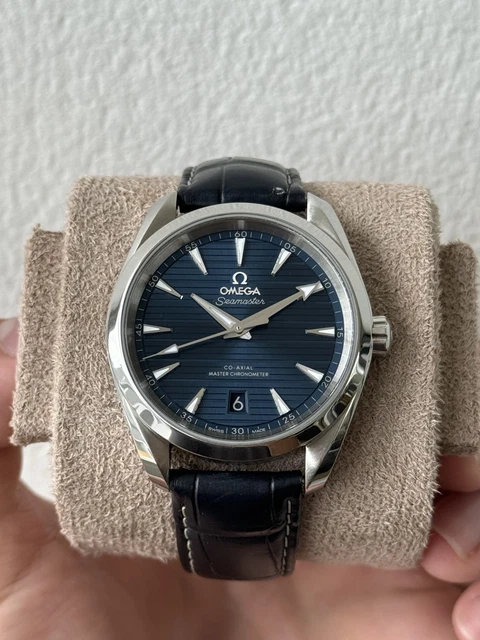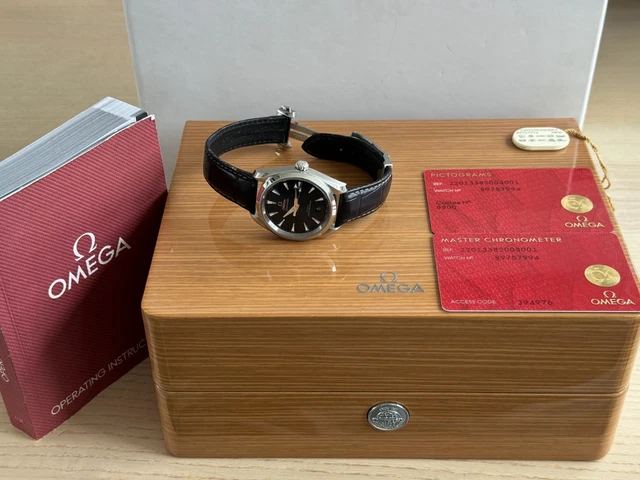 Montre Omega Seamaster Aqua Terra, diamètre 38,5 mm, cadran bleu, bracelet en cuir (réf. 220.13.38.20.03.001). Ensemble complet (montre, écrin et cartes), à l’exception de la carte indiquant la date d’achat – l’année de production exacte est donc inconnue. Néanmoins, en plus des deux autres cartes, l’acheteur recevra le certificat de chronomètre de la montre via un lien direct vers le site officiel d’Omega, attestant de son authenticité.